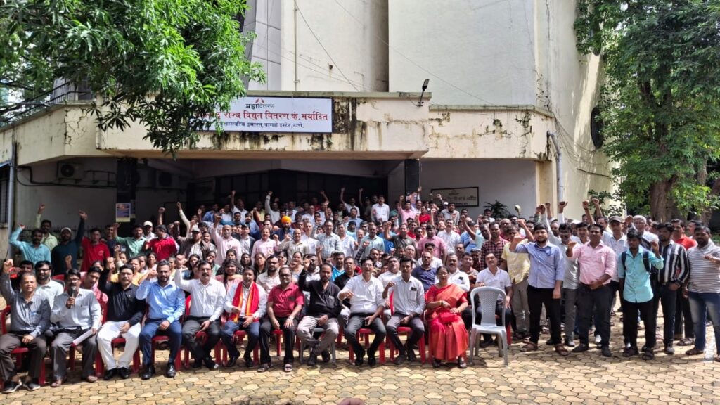 महावितरण कंपनी अधीक्षक अभियंता ठाणे मुंबई कार्यालया समोर संपात सहभागी झालेले वीज कामगार,अधिकारी, अभियंते व कंत्राटी कामगार यांची निदर्शने मुंबई : प्रतिनिधी