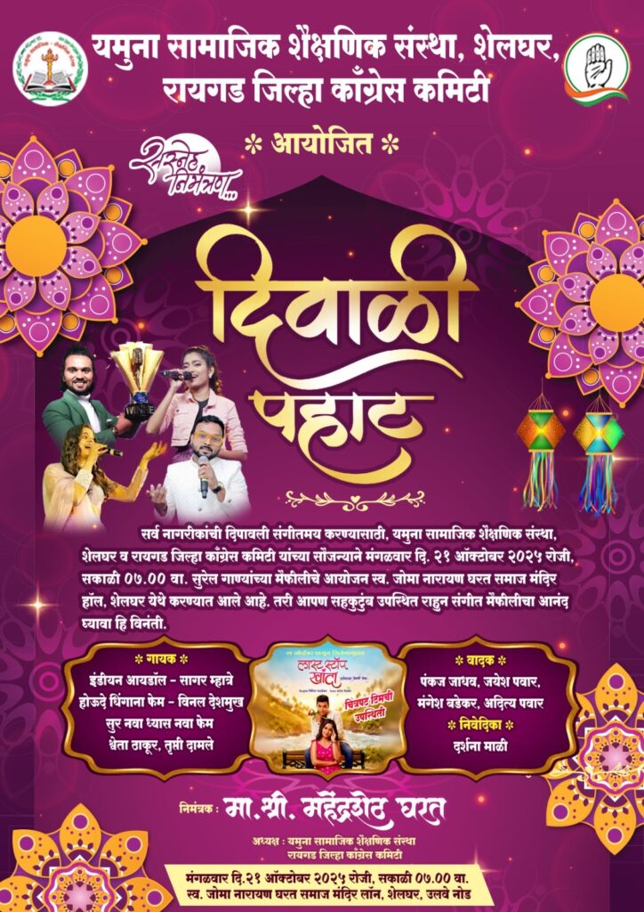 “इंडियन आयडाल” सागर म्हात्रे, `होऊ दे धिंगाणा फेम’ विनल देशमुख, `सूर नवा ध्यास नवा फेम’ श्वेता म्हात्रे, तृप्ती दामले यांच्या बहारदार गायनाने `दिवाळी पहाट’ रंगणार…
