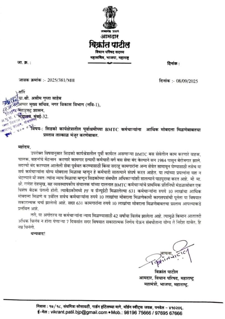 सिडको कार्यक्षेत्रातील पूर्वाश्रमीच्या BMTC कर्मचाऱ्यांना 10 लाख आर्थिक मोबदला देण्याच्या आमदार विक्रांत पाटील यांच्या प्रयत्नांना यश; लवकरच आर्थिक मोबदल्याच्या चेकचे होणार वाटप मुंबई : प्रतिनिधी…
