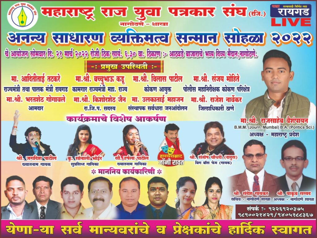 महाराष्ट्र राज युवा पत्रकार संघातर्फे अनन्य साधारण व्यक्तिमत्व सन्मान सोहळा २०२२ चे आयोजन सिटी बेल • नागोठणे • याकूब सय्यद • महाराष्ट्र राज युवा पत्रकार…