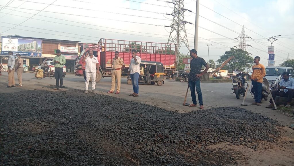 यावेळी सामाजिक कार्यांचीही आवड असणारे रसायनी पोलीस ठाण्याचे वरिष्ठ पोलिस निरीक्षक कैलास दादाभाऊ डोंगरे यांच्या प्रयत्नातून सिमेंट काॅक्रीट मिश्रण असलेला माल खड्यांत टाकून खड्डे बुजविल्याने त्यांच्या कार्याचे वाहनचालक, प्रवाशांकडून कौतुक होत आहे.वरिष्ठ पोलिस निरीक्षक कैलास दादाभाऊ डोंगरे यांनी रसायनी पोलिस ठाण्याचा चार्ज घेवून एक महिना झाला असतानाच नागरिकांच्या समस्यांकडेही लक्ष घातले आहे.दांड रसायनी रस्त्यावरील खड्डे स्वतः उपस्थित राहून भरुन घेतले.