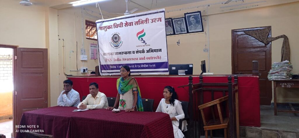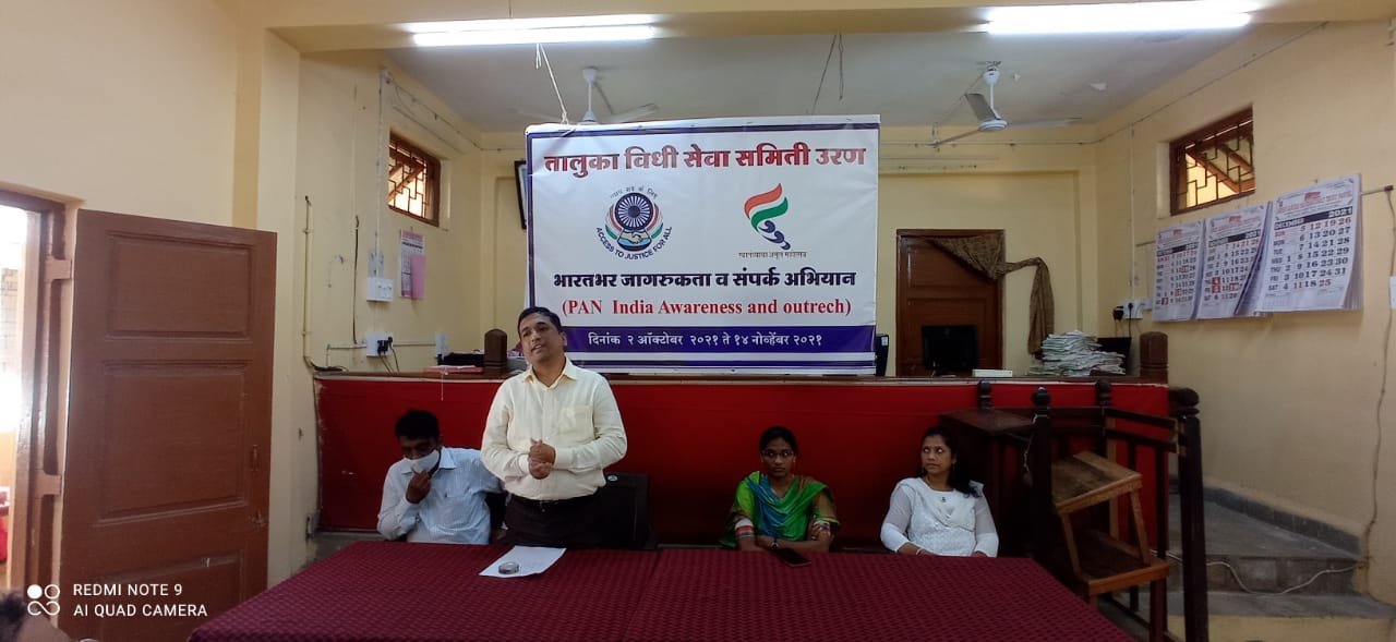 कायदेविषयक जनजागृती करण्यासाठी संपूर्ण भारतभर जागरुकता व संपर्क अभियान सुरू असून संपूर्ण देशात 2/10/2021ते 14/11/2021 दरम्यान या अभियानांतर्गत सभा, बैठका, विविध उपक्रमाद्वारे विविध कायदेविषयक जनजागृती करण्यात येणार आहे. उरण तालुका विधी सेवा समिती तर्फे जागरूकता व संपर्क अभियानाचे औचित्य साधून उरण न्यायालय येथे कौटुंबिक कायदे या विषयावर मार्गदर्शन करण्यात आले.