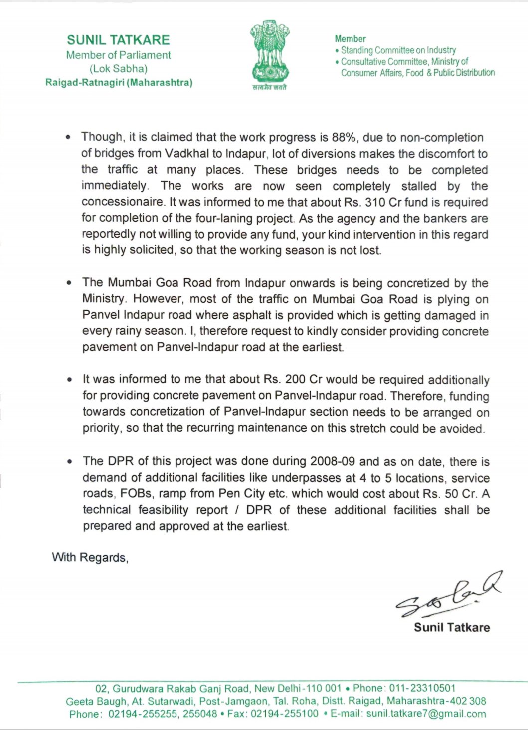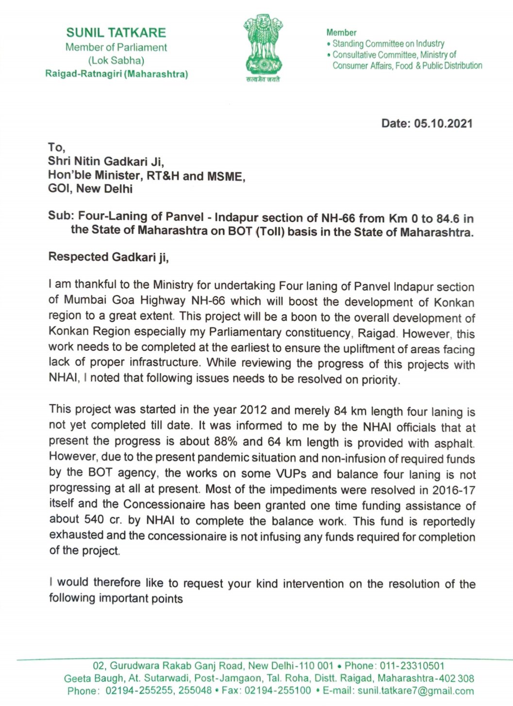 याबरोबरच मुंबई-गोवा एनएच-६६ या मार्गावरील भूसंपादनाच्या समस्येमुळे चौपदरीकरणाच्या कामावर होत असलेल्या परिणामांवर तोडगा काढण्याबाबत, बिरवाडी MIDC जवळ एनएच-६६ साठी अतिरिक्त व्हेंट एरिया प्रदान करण्याबाबत व रायगड रोड राष्ट्रीय महामार्ग एनएच-६६ एफ ला ऐतिहासिक मार्ग बनवण्याबाबत चर्चा केली. एनएच-६६ वरील कशेडी घाटातील एंट्री पॉईंट आणि एक्झिस्ट पॉईंट येथे सुशोभीकरण स्पॉट प्रदान करण्याची व लोटे MIDC जवळील सीएच १९४.६०० आवाशी गुनाडे येथे व्हीयुपी प्रदान करण्याची मागणी केली.