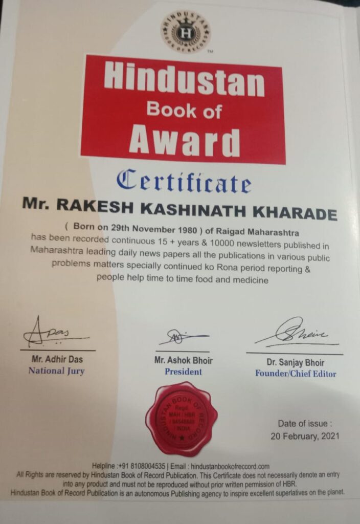 हिदु़स्थान बुक ऑफ रेकॉर्डमध्ये रायगड रसायनी येथील पत्रकार राकेश काशिनाथ खराडे यांच्या पत्रकारीतेची नोंद करण्यात आली असून त्यांना हिंदूस्थान बुक ऑफ अवार्ड सन 2021 च्या आचार्य बाळशास्त्री जांभेकर पत्रभुषण पुरस्काराने मान्यवरांच्याहस्ते सन्मानित करण्यात आले.
