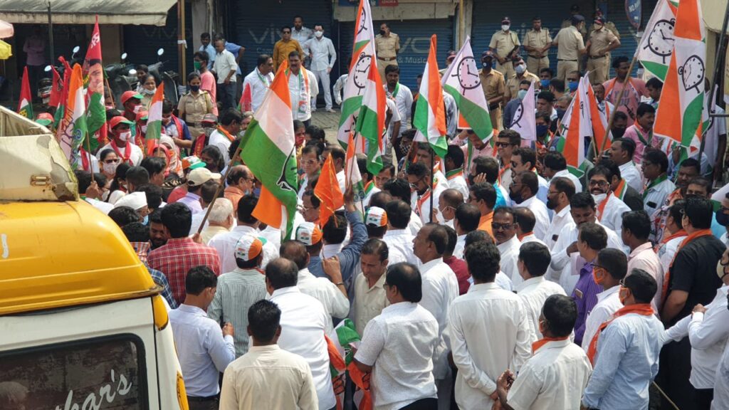 आज सकाळपासून व्यापारी वर्गांनी बंद ठेवून आपला पाठींबा दर्शविला.यावेळी महाविकास आघाडीतर्फे काँग्रेसचे जिल्हाध्यक्ष महेंद्र घरत, माजी आमदार मनोहरशेठ भोईर, राष्ट्रवादीचे प्रदेश सरचिटणीस प्रशांत पाटील, शेकाप तालुका चिटणीस मेघनाथ तांडेल, सभापती समिधा म्हात्रे, उपसभापती शुंभागीं पाटील, डॉ. मनीष पाटील, विनोद म्हात्रे, उपजिल्हाप्रमुख नरेश रहालकर, तालुका प्रमुख संतोष ठाकूर, तालुका अध्यक्ष जे. डी. जोशी, शहर अध्यक्ष किरीट पाटील, गटनेते गणेश शिंदे