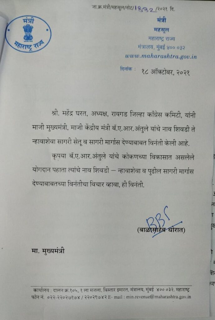 खऱ्या अर्थाने कोकणचा विकास ज्यांच्यामुळे झाला असे कोकणचे भाग्यविधाते माजी मुख्यमंत्री, माजी केंद्रीय मंत्री बॅ. ए. आर. अंतुले साहेब यांचे नाव न्हावा – शिवडी सागरी सेतूला देण्यात यावे अशी मागणी रायगड जिल्हा कॉंग्रेस अध्यक्ष महेंद्र घरत यांनी महसूलमंत्री बाळासाहेब थोरात यांच्या कडे केली.