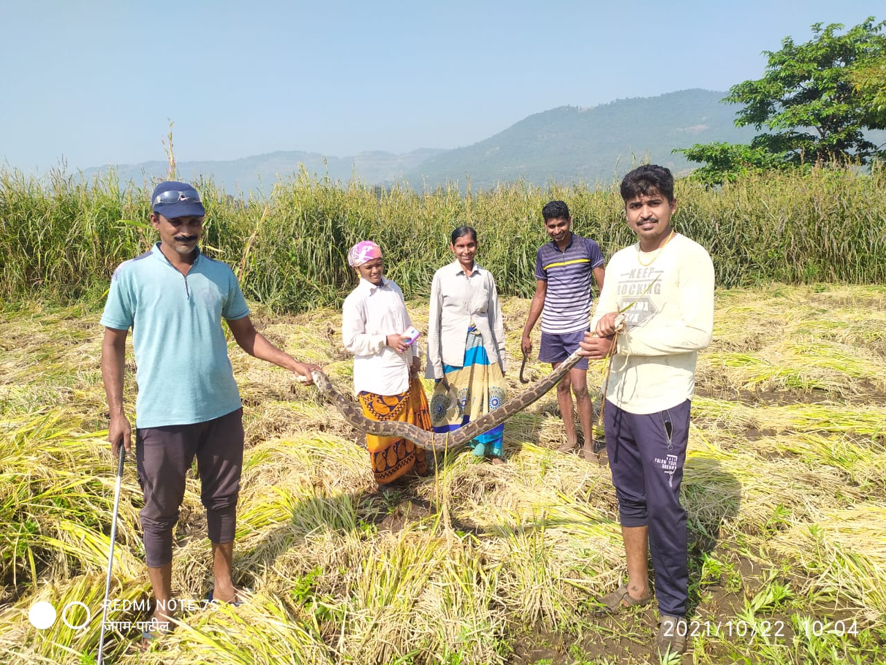 याबाबत प्राप्त झालेल्या माहितीनुसार धामणसई गावचे क्रुषीनिष्ठ शेतकरी योगेश जंगम आपल्या परिवारासह शेतीमध्ये भात कापणी करीत असताना कापलेल्या भाताच्या करपांखाली कसलीतरी हालचाल आढळून आली. त्यामुळे सहज त्यांनी करपांखाली पाहिले असता भलामोठा साप दृष्टीस पडल्याने त्यांनी त्वरीत नडवली गावचे सर्पमित्र व वन्यजीव रक्षणार्थ संस्था रायगड (SWCS) चे उपाध्यक्ष कु अजय भोसले ह्यांना संपर्क केला असता सर्पमित्र अजय भोसले यांनी लगेचच आपले सहकारी मंगेश सानप यांना घेऊन धामणसई येथे आले व भाताच्या करपांखाली दडून राहिलेल्या आठ फुटी अजगरास सुरक्षितपणे पकडून जीवदान दिले.