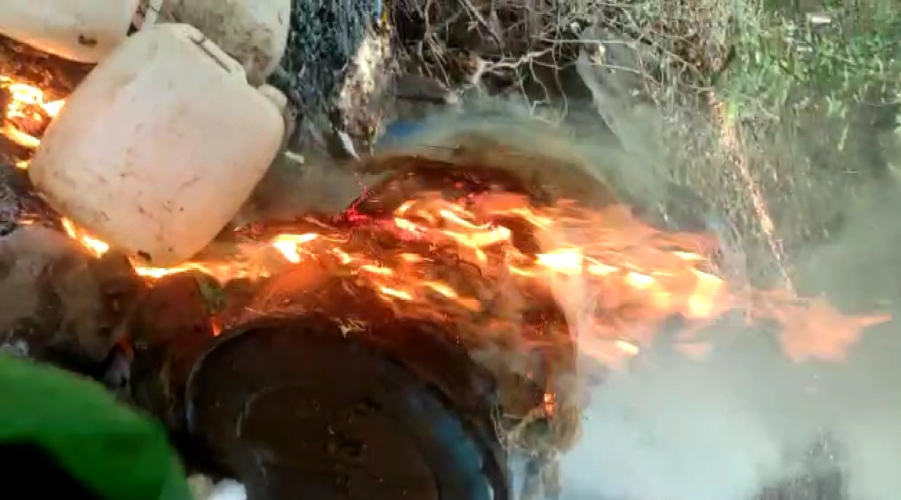 यात बेवारस स्थितीत मिळून आलेले 200 लिटर क्षमतेचे 3 प्लास्टिक ड्रममध्ये व 200 लिटर क्षमतेची एक पत्र्याच्या टाकीमध्ये तांबड्या रंगाचे उग्र वास येत असलेले एकूण 800 लिटर रसायन मिळून आले.सदरील रसायन जागीच ओतून नाश करून 3 प्लास्टिकचे ड्रम जाळून नष्ट केले.व एक पत्र्याची टाकी तोडून नुकसान केले आहे.
