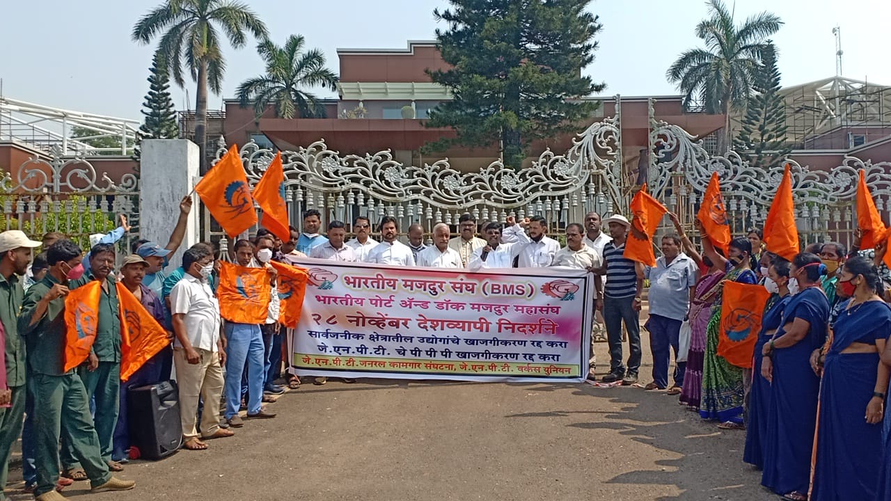 भारतीय मजदूर संघाच्या वतीने जेएनपीटी जनरल कामगार संघटना आणि जेएनपीटी वर्कर्स युनियन यांची जेएनपीटीत निदर्शने