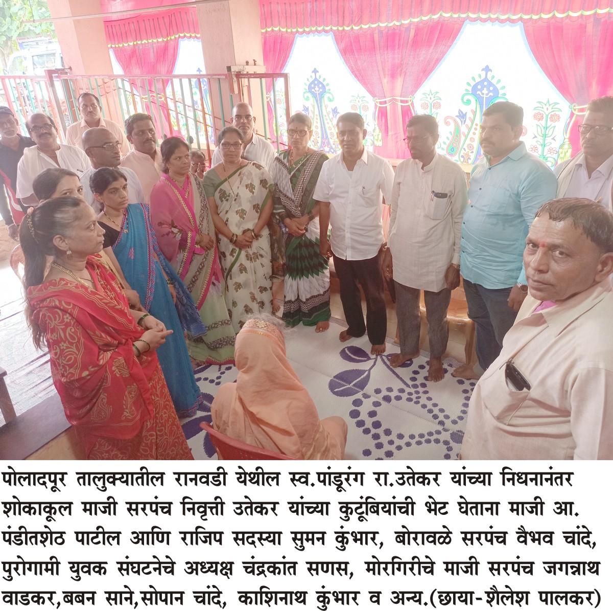 पोलादपूर तालुक्यातील रानवडी बुद्रुक येथील बोरावळे गावचे माजी सरपंच निवृत्ती पांडूरंग उतेकर यांचे वडील आणि गायनाचार्य ह.भ.प.पांडूरंग रामजी उतेकर यांचे अल्पशा आजाराने मंगळवार दि. 09 नोव्हेंबर 2021 रोजी निधन झाले. या शोकाकूल कुटूंबियांची भेट घेण्यासाठी माजी आमदार तसेच शेकापक्षाचे जाणते नेते पंडीतशेठ पाटील हे रानवडी येथे गेले असता तालुक्यातील अतिवृष्टीमुळे उदध्वस्त झालेल्या पाणीयोजनांच्या क्षेत्रातील गावकरी संभाव्य पाणीटंचाईग्रस्त होणार असल्याने पंडीत पाटील यांची भेट घेतली.
