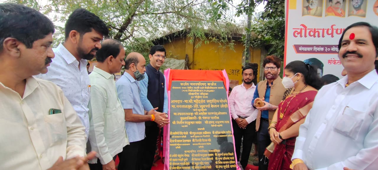 कर्जत नगरपालिकेचे नगरसेवक संकेत भासे यांच्या नगरसेवक निधीतून सेवालाल नगर व एकता नगर येथील गल्ली रस्ते काँक्रीटीकरण करणे. या झालेल्या कामाचे लोकार्पण सोहळा तसेच राज्याचे कॅबिनेट मंत्री एकनाथ शिंदे यांच्या माध्यमातून व कर्जत – खालापूर विधानसभेचे आमदार महेंद्र थोरवे यांच्या विषेश प्रयत्नातून एम एम आर डी ए च्या निधीतून दहिवली प्रभागातील मंजूर कामे एस. व्ही.एस बिल्डिंग ते अजय सुवर्ण च्या घराकडे जाणारा रस्ता, फूडकोड हॉटेल ते पाण्याच्या टाकीकडे जाणारा रस्ता, मुद्रे बु.पथदिवे बसविणे अशा आदी मंजूर विकास कामांचे कर्जत नगर परिषदेचे स्विकृत नगरसेवक संकेत भासे यांच्या वाढदिवसाचे औचित्य साधत आमदार महेंद्र थोरवे याच्या हस्ते भूमिपूजन सोहळा हा पार पडला आहे.