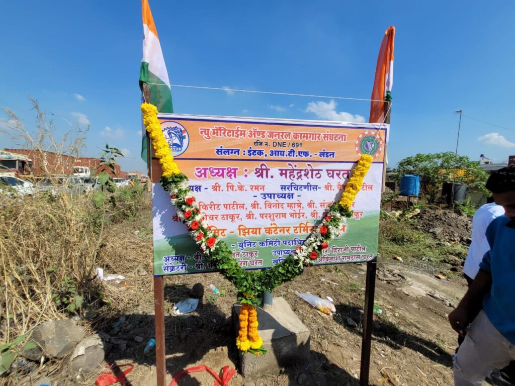 मे. झिया यार्ड धुतुम-उरण,येथील NMGKS संघटनेच्या नामफलकाचे अनावरण संघटनेचे अध्यक्ष तथा रायगड जिल्हा काँग्रेस चे अध्यक्ष महेंद्रशेठ घरत यांच्या शुभहस्ते तसेच ITF दिल्ली चे पदाधिकारी राजेंद्र गिरी, अरविंद कोशल, गिता अय्यर यांच्या उपस्थितीत संपन्न झाला.