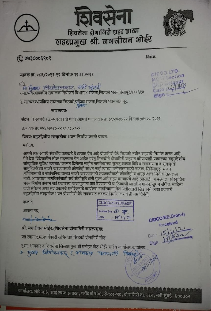 त्यामुळे सर्व प्रकारचे कार्यक्रम द्रोणागिरी शहरात व्हावेत यासाठी सिडको प्रशासनाने द्रोणागिरी शहरात त्वरित बहूउद्देशीय सांस्कृतिक भवन उभारावे अशी मागणी शिवसेना द्रोणागिरी शहर प्रमुख जगजीवन भोईर यांनी सिडको प्रशासनाकडे लेखी पत्रव्यवहार करून केली आहे.