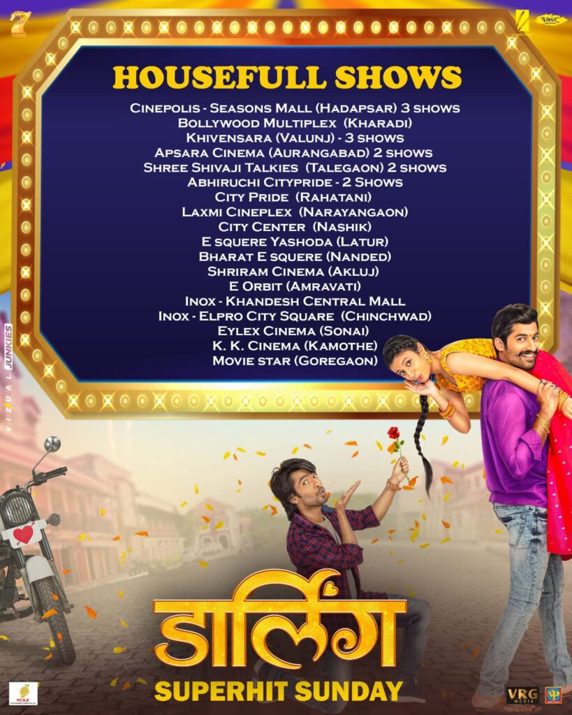 लॅाकडाऊनमुळं प्रेक्षकांच्या भेटीपासून दुरावलेला ‘डार्लिंग’ अखेर प्रदर्शित झाल्यानंतर प्रेक्षकांनीही हा चित्रपट डोक्यावर घेतल्याचं चित्र पहायला मिळत आहे. महाराष्ट्रातील काही सिनेमागृहांमध्ये ‘डार्लिंग’च्या गाण्यांवर रसिक अक्षरश: तल्लीन होऊन नाचत असल्याच्या क्लिप्स सोशल मीडियावर व्हायरल झाल्या आहेत. २५० हून सिनेमागृहांमध्ये ३००० पेक्षा जास्त स्क्रीन्सवर प्रदर्शित झालेला ‘डार्लिंग’ पाहण्यासाठी गर्दी करत आहेत. हडपसर, खर्डा, रहाटणी, नारायणगाव, तळेगाव, नाशिक, लातूर, नांदेड, अकलूज, अमरावती, खान्देश, चिंचवड, सोनाई, कामोठे, गोरेगाव, वाळूंज, औरंगाबाद, सिटिप्राईड अभिरूची येथे रविवारी हाऊसफुलचे बोर्ड झळकले.