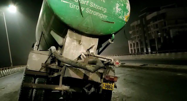 शहरातील नानासाहेब धर्माधिकारी उड्डाण पुलावरुन एक सिमेंटचा बल्कर जात असताना वाहन चालकाचा ताबा सुटून तो रस्त्याच्या दुभाजकावर जावून अडकला. यात वाहनाचे नुकसान झाले आहे. परंतु कोणीही जखमी झाले नसल्याची माहिती मिळत आहे.