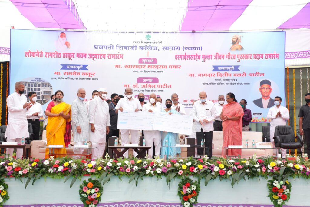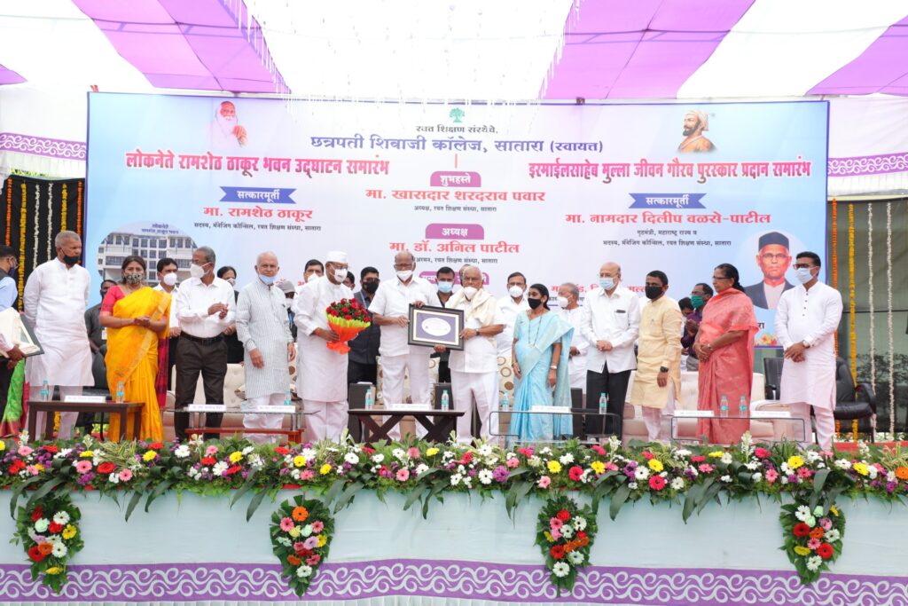 तन, मन, धनाने शिक्षण क्षेत्राला सर्वस्व अर्पण करणारे लोकनेते रामशेठ ठाकूर यांच्या अफाट कर्तुत्वाला सलाम करण्यासाठी सातारा येथील छत्रपती शिवाजी महाविद्यालयाच्या प्रांगणात उभारण्यात आलेल्या अद्ययावत सुविधायुक्त अशा ‘लोकनेते रामशेठ ठाकूर भवन’ चे उदघाटन रयत शिक्षण संस्थेचे अध्यक्ष, माजी केंद्रीय कृषी मंत्री, खासदार शरदराव पवार यांच्या हस्ते मोठ्या उत्साहात समारंभपूर्वक झाले. कर्मवीरांच्या भूमीत आजचा दिवस समस्त रायगडच नव्हे तर संपूर्ण महाराष्ट्रासाठी अभिमानाचा होता, लोकनेते रामशेठ ठाकूर यांनी आपल्या कर्तृत्वाने शिक्षण क्षेत्रात समाजसेवकाची भूमिका बजावली. आणि हा सोहळा डोळ्यात आणि हृदयात साठवून ठेवण्यासाठी राज्यातून विविध क्षेत्रातील मान्यवर, हितचिंतक उपस्थित होते.