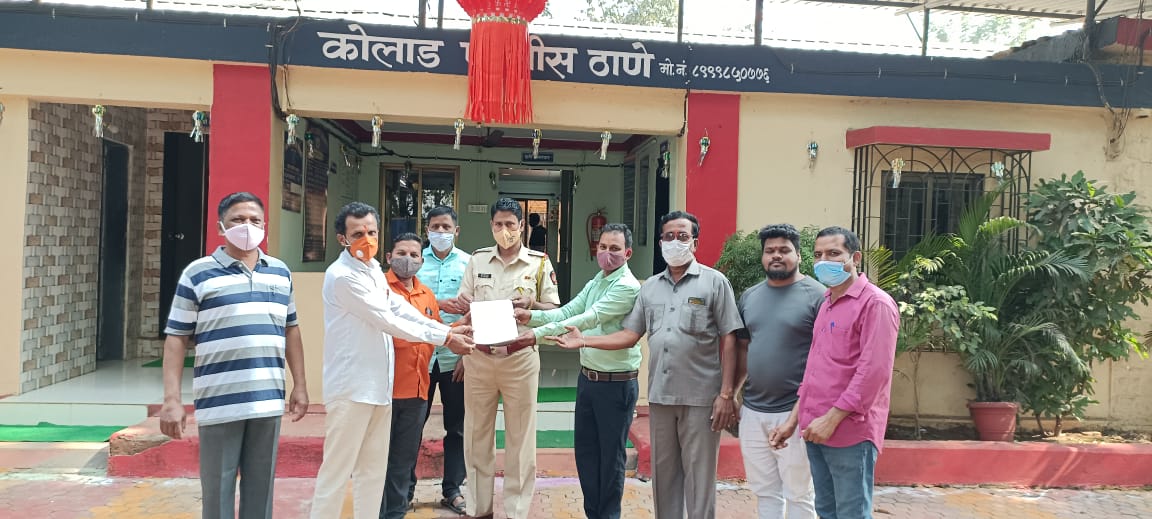 यावेळी चंद्रकांत लोखंडे, विजय बोरकर,ज्ञानेश्वर खांमकर, प्रविण शिंदे, निलेश गोरीवले प्रमोद लोखंडे, महेश शिरसाट, दिनेश खराडे यांच्या उपस्थितीत कोलाड पोलीस ठाण्याचे सहाय्यक पोलीस निरीक्षक सुभाष जाधव यांना निवेदन देण्यात आले.