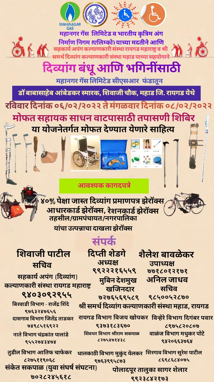 महानगर गॅस लिमिटेड याच्यां सि आर एस फंडातून अलिम्को यांच्यामदतीने , सहकार्य अपंग कल्याणकारी संस्था रायगड महाराष्ट्र, व श्री समर्थ दिव्यांग कल्याणकारी संस्था महाड रायगड यांच्या सहयोगातून रविवार दिनांक ०६ फेब्रुवारी ते मंगळवार ०८ फेब्रुवारी २०२२ रोजी डॉ बाबासाहेब आंबेडकर स्मारक, छत्रपती शिवाजी महाराज चौक महाड येथे मोफत दिव्यांगाना आवश्यक सहाय्यक साधन साहित्य वाटपासाठी तपासणी शिबिर आयोजित करण्यात येत आहे.