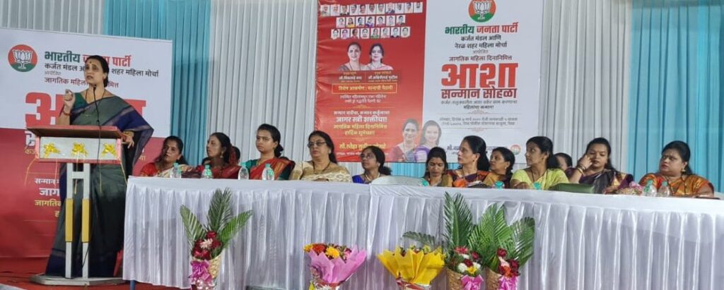 भारतीय जनता पार्टी महिला मोर्चा कर्जत तालुका आणि नेरळ शहर यांच्यावतीने जागतिक महिला दिनाचे औचित्य साधून तालुक्यातील कर्तृत्ववान महिला आणि आशा वर्कर यांचा सम्मान सोहळा नेरळ येथे आयोजित केला होता. महाराष्ट्र प्रदेश उपाध्यक्ष चित्रा वाघ यांच्या हस्ते कर्तृत्ववान महिला आणि आशा वर्कर यांचा सम्मान पत्र आणि साडी देऊन सम्मान करण्यात आला.