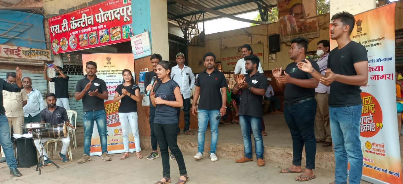 आज दिवसभरात महाडमधील शिवाजी चौक, महाड बस स्टँड, चवदार तळे परिसर, सुकट गल्ली, पोलादपूर बस स्टँड, पोलादपूर तहसील कार्यालय, रोहा तालुक्यातील रोहा बस स्थानक, सानेगाव, शेणवई व यशवंतखार या गावांमध्ये लोककलापथकांनी सादरीकरण केले.