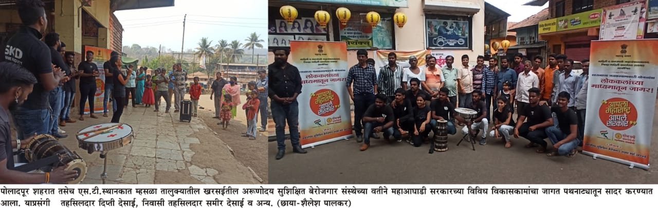 याप्रसंगी रायगड जिल्ह्यातील म्हसळा तालुक्यामधील खरसई येथील अरूणोदय सुशिक्षित बेरोजगार संस्था मर्यादितच्या कार्यकर्त्यांनी पोलादपूर शहरात सादर केलेल्या पथनाटयामुळे पोलादपूर शहरामध्ये महाआघाडी सरकारच्या कामांची जाणीव नागरिकांना झाली.