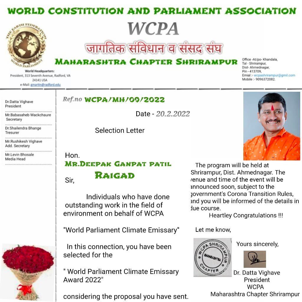 युवा ध्येय वर्ल्ड कॉन्स्टीट्यूशन अँड पार्लमेंट असोसिएशन ( डब्लूसीपीए ) अर्थात जागतिक संविधान व संसद संघाने आयोजित केलेल्या वर्ल्ड पार्लमेंट क्लायमेट एमिसरी अवॉर्ड 2022 सोहळ्याचे आयोजन मोठ्या उत्साहात पार पडले.