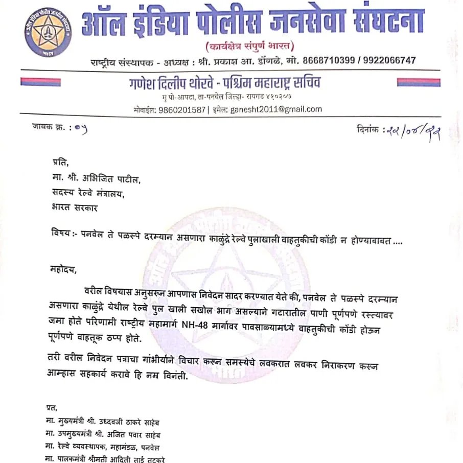 तरी या भरपूर वर्षांपासूनच्या प्रलंबित विषयाचा गांभीर्याने विचार करून समस्येचे लवकरात लवकर निराकरण करण्यासाठी ऑल इंडिया पोलीस जनसेवा संघटनेच्या वतीने केंद्रिय रेल्वे सल्लागार समिती सदस्य भारत सरकार अभिजित पाटील यांच्याकडे निवेदनाद्वारे साकडे घालण्यात आले आहे.