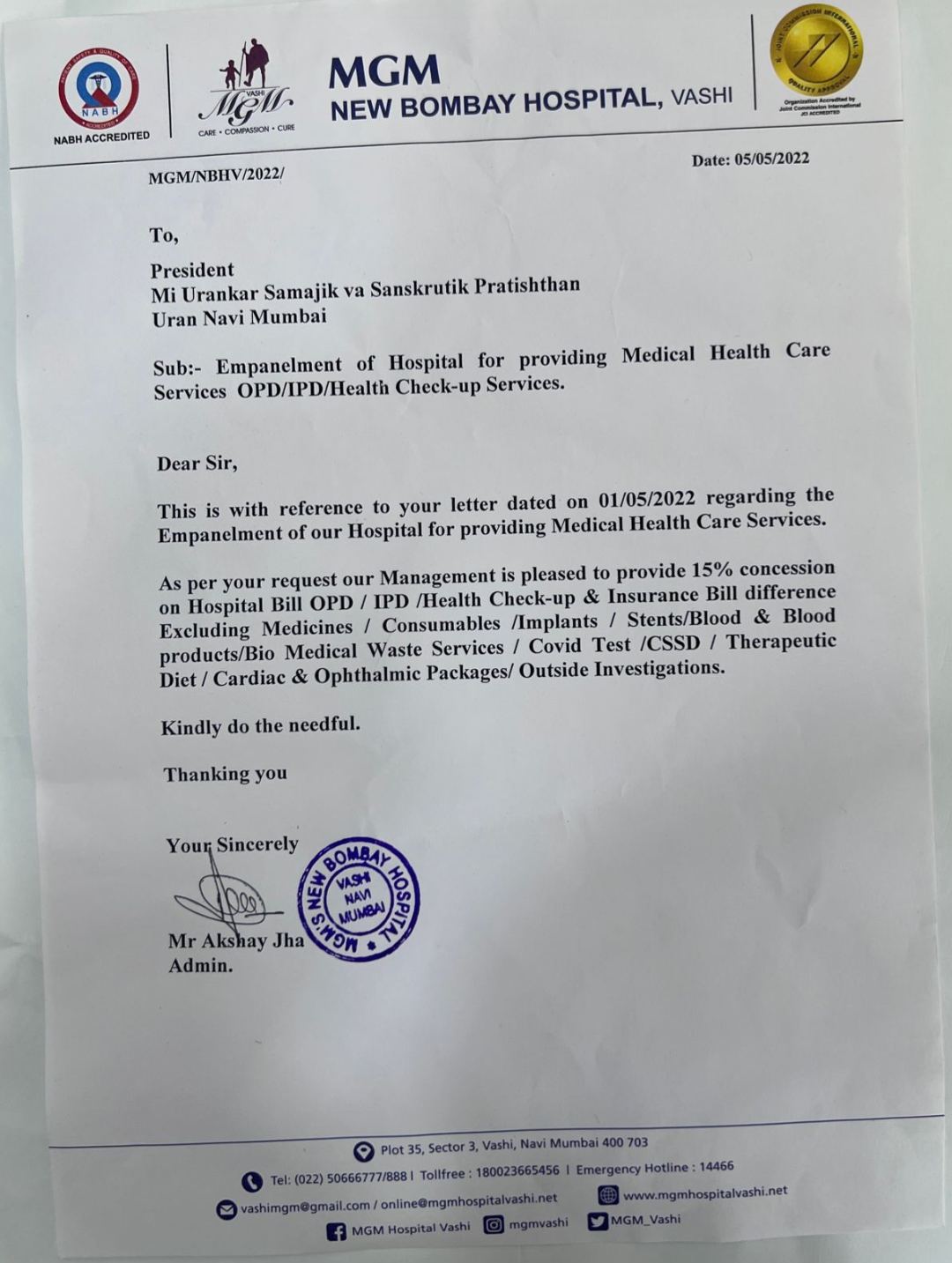 MGM हॉस्पिटल वाशी येथे अंतिम बिलामध्ये उरणच्या रुग्णांना 15 % टक्के सूट