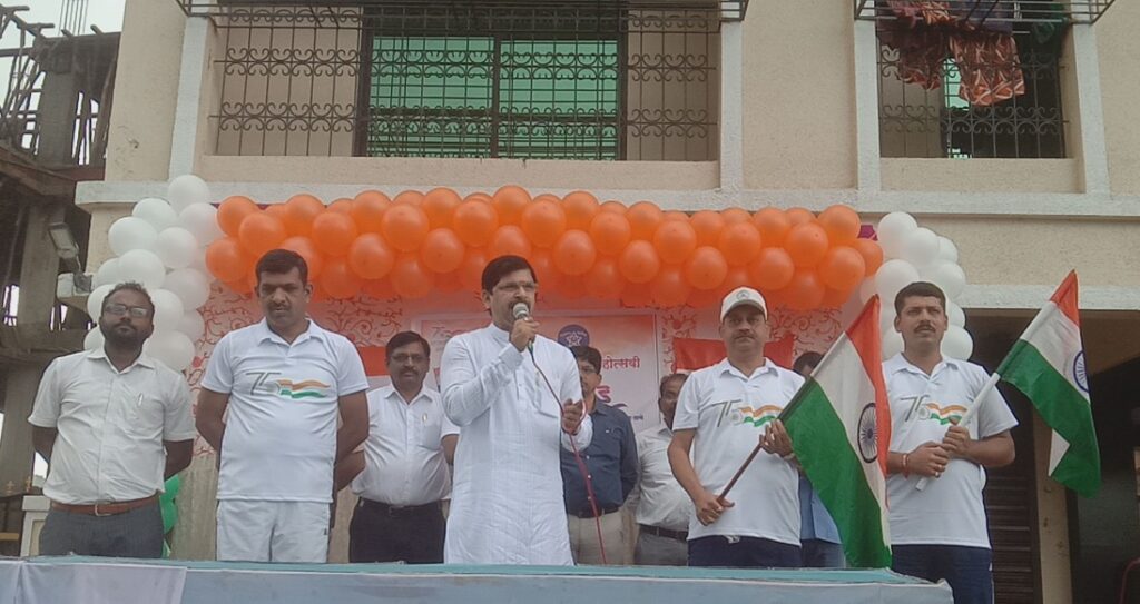 आमदार महेंद्र थोरवे यांनी देशभरामध्ये स्वातंत्र्याचा महोत्सव साजरा होत आहे, या देशाला स्वातंत्र्य मिळवून 15 ऑगस्ट 2022 ला 75 वर्ष पूर्ण होत आहेत आणि त्यानिमित्ताने या देशाचे पंतप्रधान नरेंद्र मोदी, राज्याचे मुख्यमंत्री एकनाथ शिंदे, केंद्र शासन आणि राज्य शासनाच्या एकत्रपणे याचे आयोजन करण्यात आले आहे, हर घर में तिरंगा घरोघरी तिरंगा ही संकल्पना पंतप्रधान मोदी संपूर्ण देशभरामध्ये आज 13 ऑगस्ट ते 15 ऑगस्ट दरम्यान या कार्यक्रमाचे आयोजन होत आहे, स्वातंत्र्याचा रक्तरंजित इतिहासाचे आपल्याला स्मरण व्हावं या दृष्टिकोनातून या कार्यक्रमाचा आयोजन होत असताना या देशाला स्वातंत्र्य मिळवून देण्यासाठी ज्या स्वातंत्र्यवीरांनी आपल्या प्राणाचे बलिदान दिले, ज्या स्वातंत्र्यवीरांनी आपल्या कुटुंबावर आपल्या आयुष्यावर तुळशीपत्र वाहून या देशासाठी आपल्या प्राणाचे बलिदान देऊन हा देश स्वातंत्र ठेवण्यासाठी जे महान कार्य केले आहे, त्यामुळेच आज आपण या देशांमध्ये मुक्तपणे फिरतात दिसत आहोत, या स्वातंत्र्यवीरांनी दिलेले बलिदान व्यर्थ जाऊ नये त्याचे स्मरण आजच्या युवा पिढीला व्हावे, या देशाचे उज्वल भविष्य म्हणून आपल्याकडे पाहिले जात आहे म्हणून यासाठीच हर घर मे तिरंगा ही संकल्पना पंतप्रधान मोदी यांनी संपूर्ण देशात राबविली आहे असे सांगितले, संपूर्ण कर्जत शहरांमध्ये फिरत असताना प्रत्येक ठिकाणी पाहिलं की घराच्या बाहेर त्या त्या ठिकाणी हा तिरंगा फडकवण्यात आलेला आहे हे फार अभिमानाची गोष्ट आहे की या राष्ट्रध्वजाचा सन्मान आपण सगळ्यांनी राखला पाहिजे असे सांगितले.