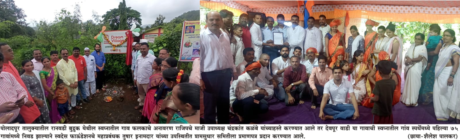 पोलादपूर तालुक्यातील वझरवाडी ग्रामपंचायत हद्दीतील देऊळवाडी, गोळेगणी ग्रामपंचायत हद्दीतील येरूणकरवाडी आणि बोरावळे ग्रुपग्रामपंचायत हद्दीतील रानवडी बुद्रुक तसेच देवपूर ग्रामपंचायत हद्दीतील देवपूर वाडी या चार गावांचा स्वप्नातील गांव स्पर्धेतील पहिल्या 75 गावांमध्ये समावेश झाला आहे. यामध्ये देवपूरवाडी या गावाने पाणीयोजना, रस्तेदुरूस्ती, सुका कचरा ओला कचरा, खेडयाकडे परत चला, शिक्षण व महिला आरोग्य अशा सर्वच क्षेत्रांमध्ये लक्षणीय कामगिरी केली असल्याने देवपूरवाडीमध्ये स्वप्नातील गाव होण्याची पुरेपूर क्षमता स्पष्ट दिसून येत असताना सातत्य टिकवून धरण्यासाठीच आता ग्रामस्थ व महिलांनी प्रयत्न करावे, असे आवाहन स्वदेस फाऊंडेशनचे महाप्रबंधक तुषार इनामदार यांनी केले.