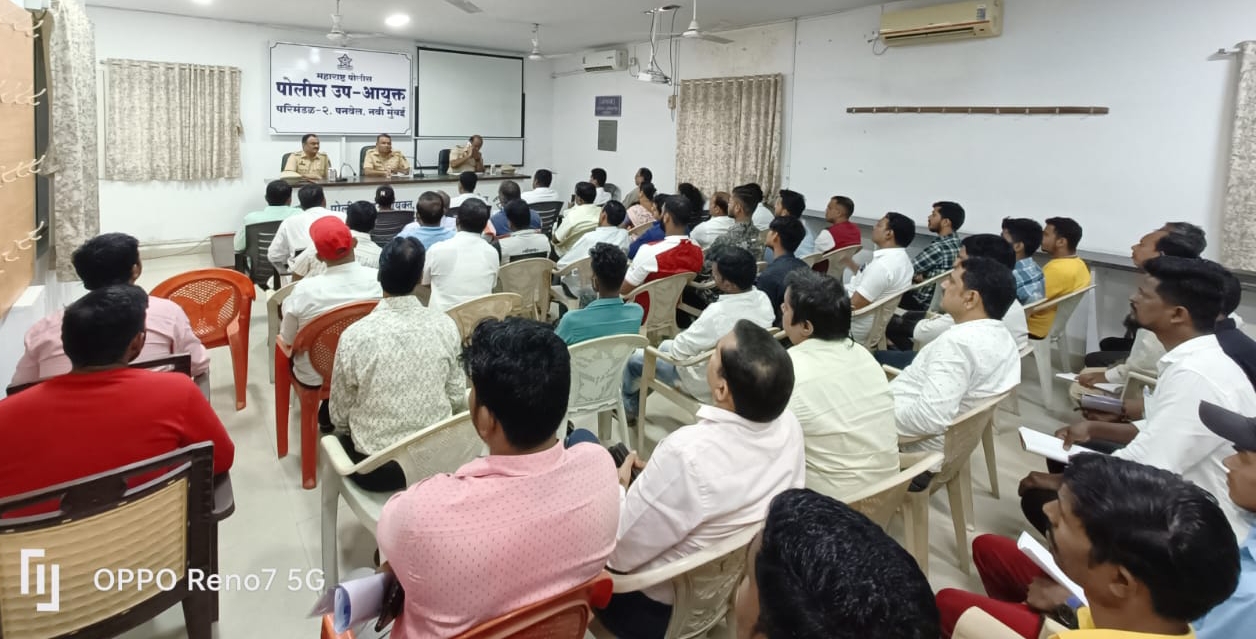 येणारा नवरात्रोत्सव शांततेत आणि उत्साहात पार पडण्यासाठी नवी मुंबई पोलीस आयुक्तालय परिमंडळ 2 अंतर्गत पनवेल तालुका पोलीस स्थानका नजीक असणाऱ्या मंथन हॉल येथे अत्यंत महत्त्वपूर्ण बैठकीचे आयोजन करण्यात आले. बुधवार दिनांक 21 सप्टेंबर रोजी सायंकाळी पार पडलेल्या या बैठकीला पोलीस उपायुक्त शिवराज पाटील यांनी मार्गदर्शन केले. यावेळी पोलीस सहआयुक्त भागवत सोनावणे आणि पनवेल तालुका पोलीस स्थानकाचे वरिष्ठ पोलीस निरीक्षक रवींद्र दौंडकर उपस्थित होते.