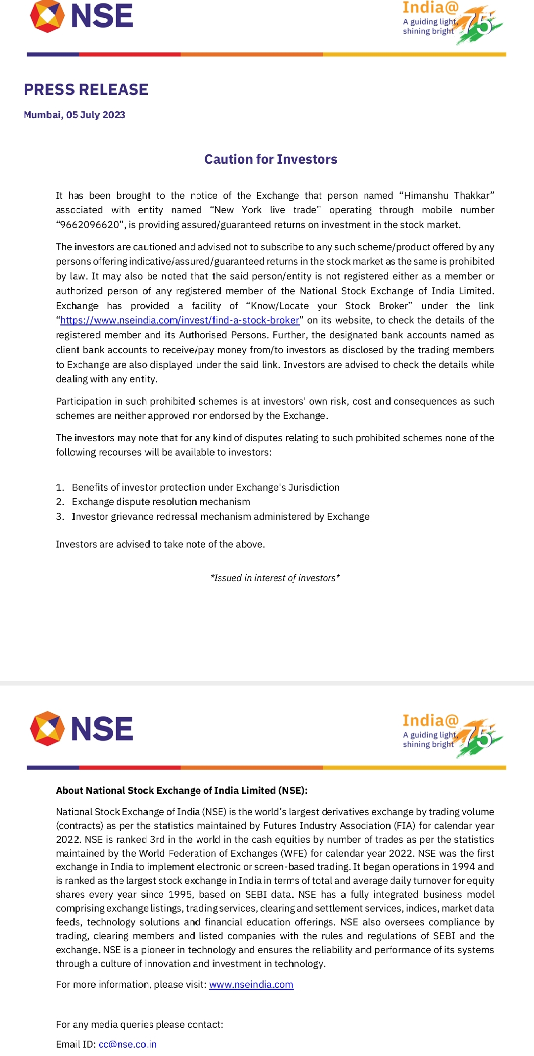 “हिमांशू ठक्कर” नावाची, “न्यू यॉर्क लाईव्ह ट्रेड” नावाच्या कंपनीशी संबंधित असलेली, “९६६२०९६६२०” या मोबाईल क्रमांकामार्फत काम करणारी व्यक्ती शेयर बाजारात गुंतवणुकीवर खात्रीलायक/गॅरंटीड परतावा देत आहे. मात्र याठिकाणी गुंतवणूकदारांना सावधान राहण्याचा इशारा आणि असा सल्ला देण्यात येत आहे की, शेयर बाजारात सूचक/खात्रीलायक/गॅरंटीड लाभ देणाऱ्या कोणत्याही व्यक्तींनी देऊ केलेल्या कोणत्याही अशा योजना/उत्पादनाला सबस्क्राईब करू नका कारण अशाप्रकारे शेयर बाजारात सूचक/खात्रीलायक/गॅरंटीड लाभ देणाऱ्या योजना/उत्पादने आणण्यास कायद्याने प्रतिबंध घालण्यात आलेला आहे. याची देखील नोंद घ्यावी की, सदर व्यक्ती/कंपनी ही नॅशनल स्टॉक एक्स्चेंज ऑफ इंडिया लिमिटेडची सदस्य किंवा कोणत्याही नोंदणीकृत सदस्यांची अधिकृत व्यक्ती नाही. एक्स्चेंजने “https://www.nseindia.com/invest/find-a-stock-broker” या लिंकखाली “नो/लोकेट युअर स्टॉक ब्रोकर” ही सुविधा वेबसाईटवर दिलेली आहे, त्याठिकाणी नोंदणीकृत व्यक्ती आणि त्यांच्या अधिकृत व्यक्तींचे तपशील तपासता येतात. याच लिंकखाली ट्रेडिंग सदस्यांनी एक्स्चेंजला कळविलेले, गुंतवणूकदारांकडून पैसे घेण्यासाठी/गुंतवणूकदारांना पैसे अदा करण्यासाठीची नेमून देण्यात आलेली बँक खाती देखील क्लायन्ट बँक अकाउंट्स म्हणून नमूद करण्यात आली आहेत. कोणत्याही कंपनीसोबत व्यवहार करताना हे तपशील जरूर तपासावेत असा सल्ला गुंतवणूकदारांना देण्यात येत आहे.