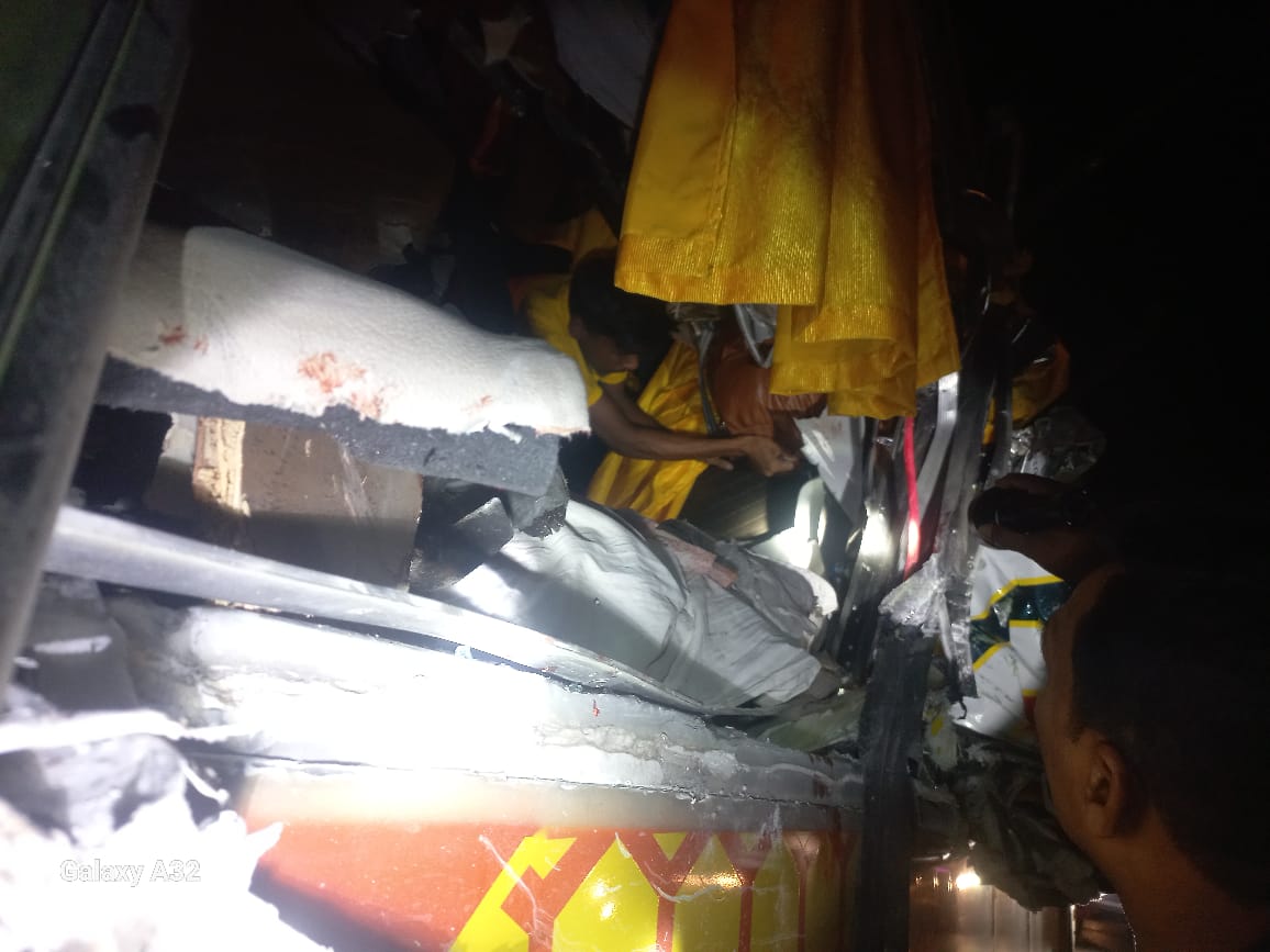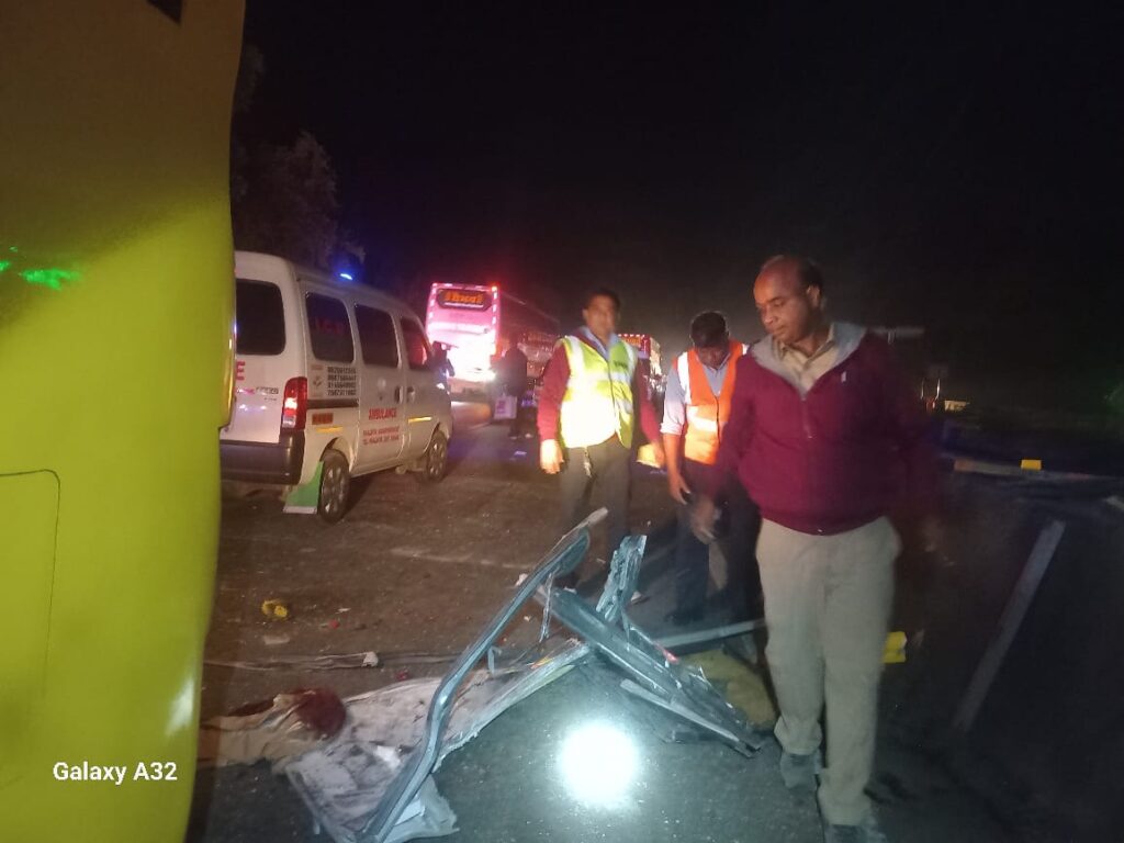रविवार 10 डिसेंबर रोजी मध्यरात्री दीड वाजण्याचे सुमारास मुंबई पुणे एक्सप्रेस वे वर कि.मी. 40:00 च्या दरम्यान वैभव ट्रॅव्हल्सची बस नं क्र. MH-09-GJ-9630 वरील चालक शिरीष राजाराम ढेकळे वय -43 वर्षे रा. कराड हे मुंबईकडून पुणेकडे गाडी घेऊन जात असताना ट्रेलर क्र. RJ-14 -JU – 9745 च्या मागील बाजूस धडकली. त्यामुळे बस मध्ये डाव्या बाजूला बसलेल्या सहयोगी बस चालक राज गावडे – वय 40 वर्षे रा. सांगली याचा डोक्याला गंभीर दुखापत झाल्याने जगीच मृत्यू झाला. बस मधील जखमी शैलेश शेटके, प्रदीप शिवाजी चव्हाण, सुधीर भागवत, राहुल भागवत, रोहित भोसले या पाच जखमींना एम जी एम येथे तर स्नेहा मेहता,जितेश चतुर्वेदी या दोन जणांना लोकमान्य टिळक हॉस्पिटल – पुणे येथे पुढील उपचाराकरता पाठविण्यात आले आहे.