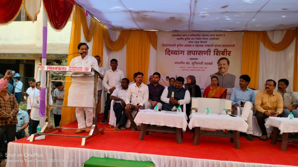 उद्घाटन प्रसंगी सुनील तटकरे म्हणाले, मतदारसंघातील दिव्यांग बांधवांच्या समस्या लक्षात घेऊन सामाजिक न्याय व अधिकारिता मंत्रालय भारत सरकार व भारतीय कृत्रिम अंग निर्माण निगम (अलीम्को ) यांच्या माध्यमातून दिव्यांगासाठी कृत्रिम अवयव व सहाय्यक उपकरणे यांची उपलब्धता आपण करत आहोत . दिव्यांगांचे शिक्षण, प्रशिक्षण,पुनर्वसन, रोजगार, त्यांच्यातील सुप्त कलांना वाव देण्यासाठी कल्याणकारी योजना राबवण्यासाठी समान संधी केंद्र आणि राज्य शासन सातत्याने प्रयत्नशील आहे. दिव्यांग मंत्रालय स्थापन करणारे महाराष्ट्र हे देशातील पहिले राज्य आहे. दिव्यांग बांधवांच्या सर्वांगीण विकासाच्या दृष्टिकोनातून शासनाच्या माध्यमातून राबवण्यात येणाऱ्या सर्व योजना सर्वसामान्य व्यक्तीपर्यंत पोहोचवण्याचे दायित्व खासदार या नात्याने माझे आहे . अलीम्को संस्थेच्या माध्यमातून दिव्यांग व्यक्तींना कृत्रिम अवयव व इतर साहित्य देण्यासाठी, मोजमाप घेण्यात येणार आहे वैद्यकीय अधिकाऱ्या मार्फत तपासणी करून गरजेप्रमाणे कृत्रिम हात, कृत्रिम पाय, कुबड्या,तीन चाकी सायकल, सीपी चेअर, व्हील चेअर,डिजिटल स्टिक, डिजिटल श्रवण यंत्र व मतिमंद मुलांसाठी शैक्षणिक किट आपण दिव्यांग बांधवांना उपलब्ध करून देत आहोत. माझ्या सर्व दिव्यांग बांधवांचे आयुष्य सुखकर व आनंददायी करणे हे माझं नैतिक कर्तव्य आहे असे सुनील तटकरे यांनी सांगितले .