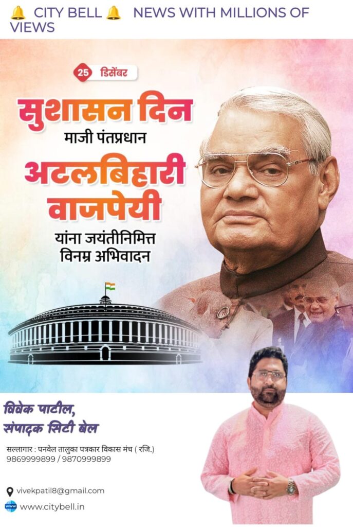 यावेळी आमदार प्रशांत ठाकूर यांनी अभिवादन केल्यानंतर आदरांजली वाहताना म्हंटले कि, आपला देशआपले लाडके माजी पंतप्रधान दिवंगत अटलबिहारीवाजपेयी यांची १०० वी जयंती अर्थात सुशासन दिवस साजरा करत आहे. उत्तुंग व्यक्तिमत्त्वाचे मुत्सद्दी राजकारणीम्हणून ते आजही अगणित लोकांना प्रेरणा देत आहेत. त्यांनीआधुनिक भारताची उभारणी करण्याचे स्वप्न पाहिलेहोते. देशातील सर्वांना विशेषत: गरीब आणि वंचितघटकांना केंद्रबिंदू मानून त्यांनी काम केले. त्याच वेळी त्यांच्यासरकारने अनेक आर्थिक सुधारणा करून भारताच्या आर्थिकउत्थानाचा पाया रचला. त्याच मार्गावर पंतप्रधान नरेंद्र मोदी हेसुद्धा काम करत आहेत. अटलजींनी आपल्या जीवन प्रवासातसमृद्ध साहित्यकृतींच्या निर्माता असलेल्या या लेखक आणिकवी मनाच्या व्यक्तिमत्त्वाने आपल्या लेखनात शब्दांचा वापरहा प्रेरणा देण्यासाठी, विचार करायला प्रवृत्त करण्यासाठीकेला. ते सर्व वयोगटातील लोकांच्या मनात घर करून राहिलेआहेत. भारतीय जनता पक्षाच्या आमच्या सारख्या असंख्यकार्यकर्त्यांना त्यांच्या व्यक्तिमत्वातून शिकता आले आहे. आपल्या देशाच्या क्षमतेवर असलेला अटलजींचा अढळविश्वास आपल्या सर्वांना उच्च ध्येय आणि कठोर परिश्रमकरण्यासाठी सतत प्रेरणा देत आहे, असेही त्यांनी नमूद करतआदरांजली वाहिली.