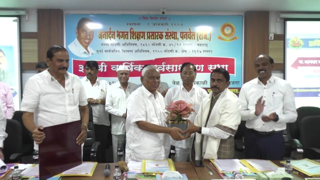 पनवेल (प्रतिनिधी) जनार्दन भगत शिक्षण प्रसारक संस्थेची 34 वी वार्षिक सर्वसाधारण सभा संस्थेचे चेअरमन लोकनेते रामशेठ ठाकूर यांच्या प्रमुख उपस्थितीत नुकताच झाली.या सभेत संस्थेच्या विविध विषयांवर सविस्तर चर्चा करण्यात आली तसेच आमदार प्रशांत ठाकूर यांचा जाहीर सत्कार करण्यात आला. या सभेमध्ये संस्थेच्या विविध शाळांना मिळालेल्या पुरस्काराबद्दल तसेच विविधि स्पर्धां तसेच परीक्षांमध्ये उज्ज्वल यश प्राप्त केलेल्या विद्यार्थ्यांचा सत्कार करण्यात आला.