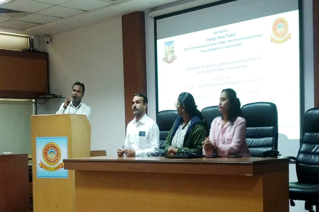 पनवेल (प्रतिनिधी) जनार्दन भगत शिक्षण प्रसारक संस्थेच्या चांगू काना ठाकूर आर्टस्, कॉमर्स अँड सायन्स कॉलेज न्यू पनवेल (स्वायत्त) येथे आजीवन अध्ययन व विस्तार विभाग आणि युनायटेड वे मुंबई यांच्या संयुक्त विद्यमाने “कचरा व्यवस्थापन आणि खारफुटी संवर्धन” या विषयावर कार्यक्रम संपन्न झाला.