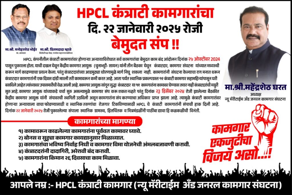 अतिरिक्त पाताळगंगा एम.आय.डी.सि.येथील केंद्र सरकारचा उपक्रम असलेला HPCL फिलिंग प्लॅन्ट उभा करतांना स्थानिकांच्या जमिनी संपादित करण्यात आल्या आहेत. या कंपनीत तिन्ही कंत्राटदार स्थानिक असूनही स्थानिक तरुणांवर अन्याय होताना दिसत आहे. या कंत्राटी कामगारांना 7 वाजताच्या ड्युटीसाठी पहाटे 5:30 वाजता जेवणाचा डबा घेवून रांगेत उभे रहावे लागत आहे. कंत्राटदार आपल्या मर्जितील कामगारांना प्रथम प्राधान्य देतात व इतरांना घरी परत पाठवितात त्यामुळे त्यांना महिन्यातून 20 दिवसपण काम मिळत नाही. कामगारांनी अचानक दांडी मारली तर त्यांना दुसऱ्या दिवसापासून घरी बसविले जाते. कामगारांना सन्मानाची वागणूक दिली जात नाही.कामगारांना भेडसावणाऱ्या समस्यांना कंटाळून सर्व कामगारांनी आठ महिन्यांपूर्वी कामगार नेते महेंद्रशेठ घरत यांच्या न्यू मेरिटाईम अँड जनरल कामगार संघटनेची स्थापना केली. याचाच राग कंत्राटदारांनी मनात धरून कामगारांचे नेतृत्व करणाऱ्या कामगारांना घरी बसविले आहे. आतापर्यंत 19 कामगारांना मागील सहा महिन्यांपासून घरी बसविले आहे.