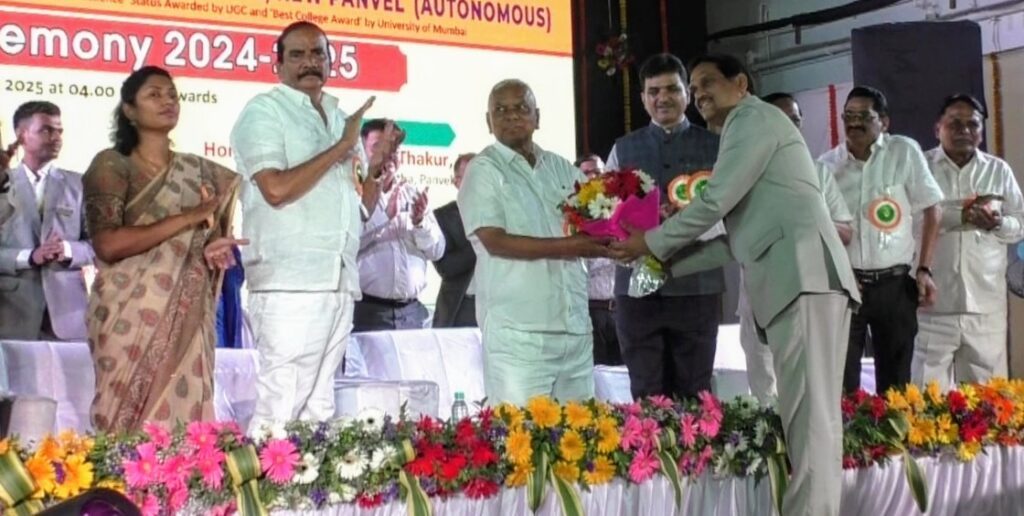 पनवेल (प्रतिनिधी) जनार्दन भगत शिक्षण प्रसारक संस्थेच्या खांदा कॉलनी येथील चांगु काना ठाकूर आर्टस्, कॉमर्स अँड सायन्स महाविद्यालयाचा (स्वायत्त) वार्षिक पारितोषिक वितरण समारंभ आणि दर्पण २०२४-२५ सोहळा मोठ्या उत्साहात संपन्न झाला. या प्रसंगी पहिल्या सत्रात विद्यार्थ्यांचे विशेष अभिनंदन करण्यासाठी प्रमुख अतिथी म्हणून सातारा येथील कर्मवीर भाऊराव पाटील विद्यापीठाचे कुलगुरू प्रो. डॉ. ज्ञानदेव म्हस्के, जनार्दन भगत शिक्षण प्रसारक संस्थेचे चेअरमन माजी खासदार लोकनेते रामशेठ ठाकूर यांची विशेष उपस्थिती लाभली.
