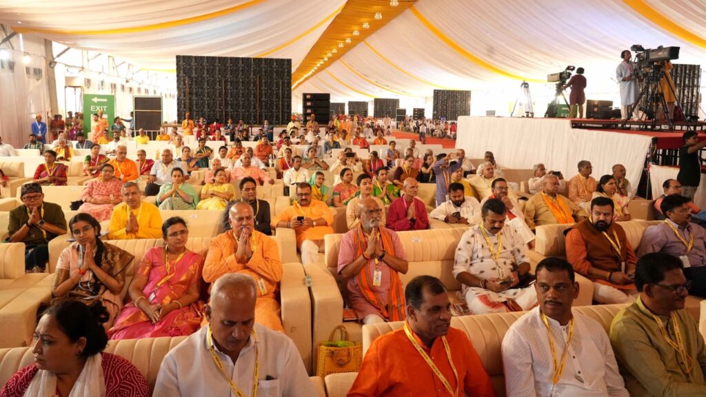 फोंडा, गोवा (सच्चिदानंद परब्रह्म डॉ. आठवलेनगरी) – भारतात ‘रामराज्य’ हे केवळ एक धार्मिक आदर्श नव्हे, तर संस्कृती, नीती, आणि न्यायाधिष्ठित शासन व्यवस्थेचे प्रतीक मानले जाते. या महान उद्दिष्टाच्या दिशेने एक महत्वपूर्ण पाऊल उचलत ‘सनातन राष्ट्रा’साठी ‘रामराज्य संकल्प जपयज्ञा’द्वारे एक कोटी श्रीरामनामाचा जप सनातन संस्थेच्या वतीने फर्मागुडी, फोंडा गोवा येथे आयोजित सनातन राष्ट्र शंखनाद महोत्सवात करण्यात आला. ‘देशविदेशातून आलेल्या २५ सहस्रपेक्षा अधिक भाविकांनी अत्यंत भावपूर्ण वातावरणात ‘श्रीराम जय राम जय जय राम’ असा नामजप केला. या जपयज्ञामुळे संपूर्ण वातावरण राममय झाले होते.
