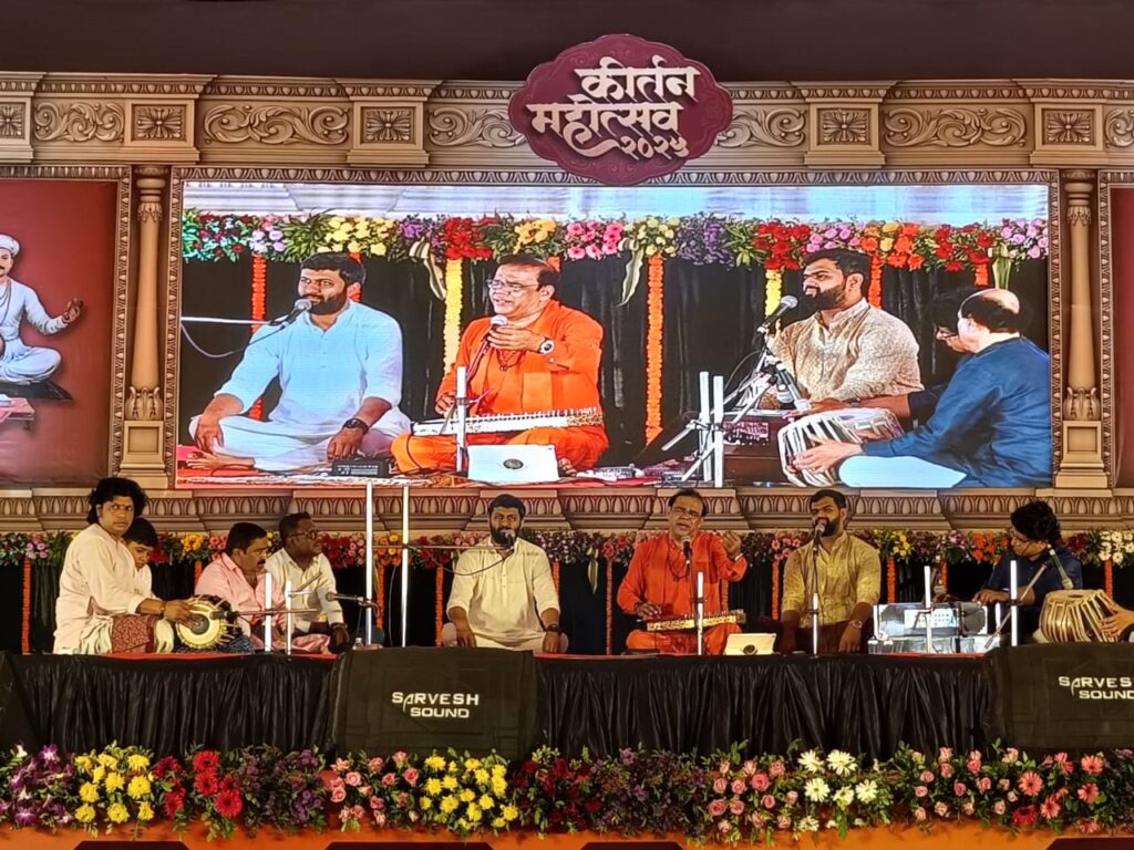 चौकट- “कीर्तन महोत्सव” म्हणजे कीर्तनाच्या माध्यमातून धार्मिक, सांस्कृतिक आणि सामाजिक जागर करणारा एक भव्य कार्यक्रम. हा एक पारंपरिक उत्सव आहे जो महाराष्ट्रात आणि इतर मराठी भाषिक भागात मोठ्या उत्साहाने साजरा केला जातो. त्यामुळे त्याचे महत्व आणि मान्सून पूर्व पावसाची हजेरी लक्षात घेता येथे येणाऱ्या वारकरी सांप्रदायातील मंडळींना या भक्तीसंगम मेळाव्यात कोणतीही कमी भासू नये यासाठी आयोजकांकडून उत्तम व्यवस्था करण्यात आली आहे. किमान तीन हजार लोकांची बैठक व्यवस्था असलेल्या या ठिकाणचा मंडप वॉटरप्रूफ पद्धतीचा उभारण्यात आला आहे. त्याचबरोबरीने या ठिकाणी संतांच्या मूर्ती व प्रतिमा आकर्षक अशा होत्या. मंडपामध्ये संतांच्या आकर्षक मूर्ती व प्रतिमांचे सादरीकरण हे विशेष लक्षवेधी होते. त्या प्रतिमांकडे नजर गेल्यावर भाविकांच्या मनात भक्तिभाव निर्माण होऊन, जणू काही साक्षात दर्शनच झाले आहे, असा अनुभव या ठिकाणी येत आहे.