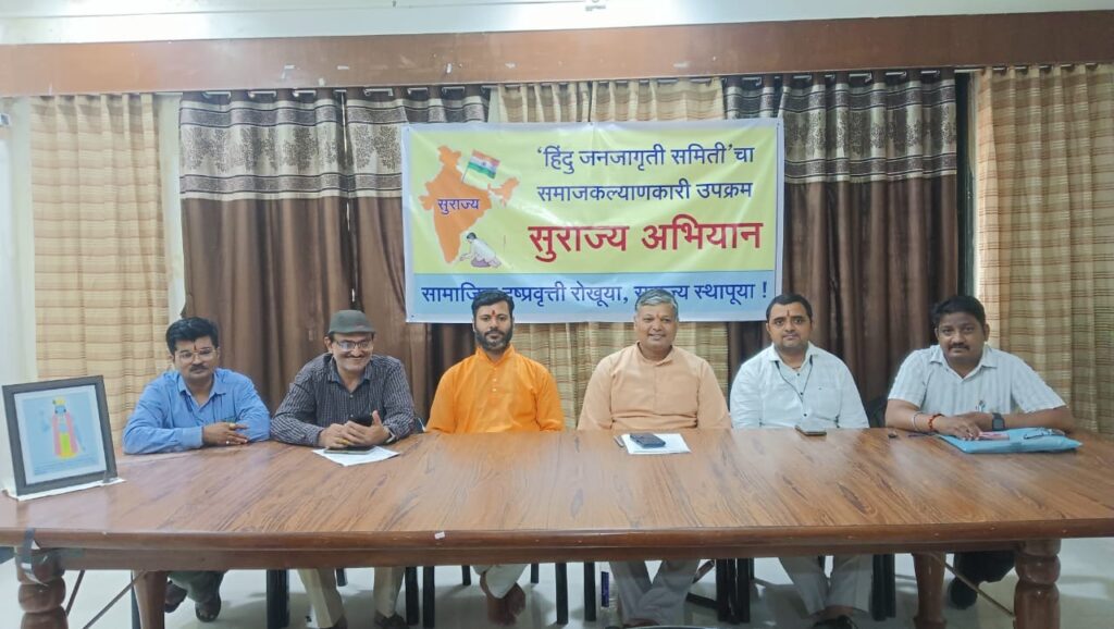 जळगाव येथील पद्मालय विश्रामगृह येथे झालेल्या पत्रकार परिषदेत हिंदु जनजागृती समितीचे उत्तर महाराष्ट्र संघटक श्री. प्रशांत जुवेकर, अधिवक्ता निरंजन चौधरी, माहिती अधिकार कार्यकर्ते श्री. नरेंद्र सपकाळे आणि समितीचे श्री. गजानन तांबट हे उपस्थित होते.