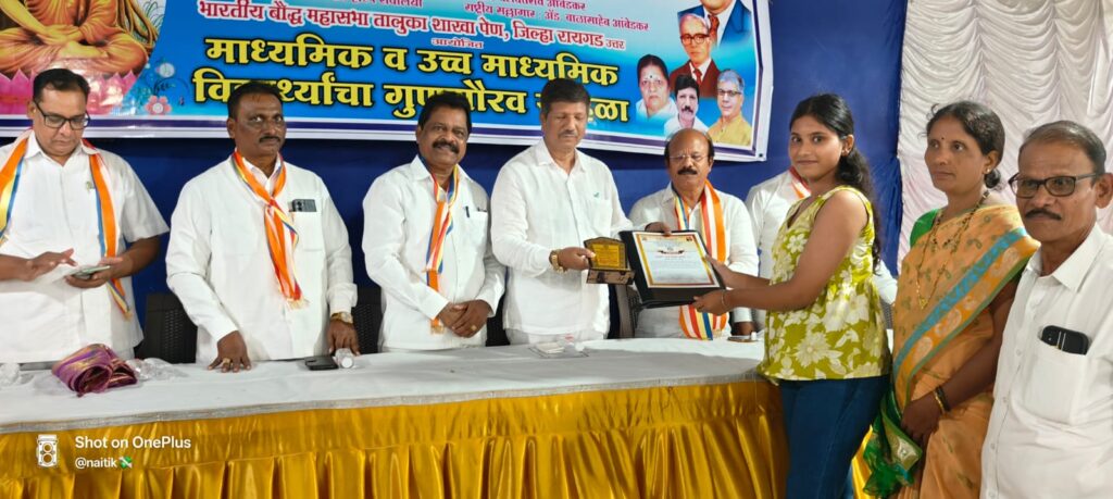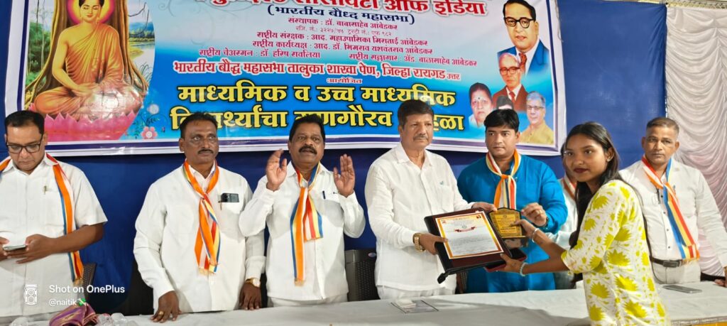 भारतीय बौद्ध महासभा आणि वंचित बहुजन आघाडी पेण तालुका यांच्यावतीने आज माध्यमिक आणि उच्च माध्यमिक परीक्षेत उत्तीर्ण झालेल्या विद्यार्थ्यांचा गुणगौरव समारंभ महात्मा गांधी वाचनालय सभागृहात करण्यात आला.या कार्यक्रमाला संस्थेचे कार्याध्यक्ष भिमराव आंबेडकर, राष्ट्रीय सचिव भिकाजी कांबळे, प्रदेश कोषाध्यक्ष प्रशांत गडकरी, वंचित जिल्हाध्यक्ष दिपक गायकवाड, पेण तालुकाध्यक्ष सुनील धामणकर, बौद्ध महासभेचे तालुकाध्यक्ष चंद्रकांत सोनवणे, सुशिल वाघमारे, प्रकाश सोनावणे, संतोष जाधव, किशोर वाघमारे, मंगेश कांबळे आदिंसह महिला आघाडीच्या पदाधिकारी तसेच ज्येष्ठ बौद्धाचार्य, समता सैनिक दलाचे पदाधिकारी, विद्यार्थी वर्ग मोठ्या संख्येने उपस्थित होते.