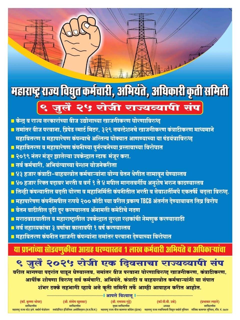 महाराष्ट्र राज्य वीज कामगार,अभियंते, अधिकारी संयुक्त कृती समितीच्या नेतृत्वाखाली दिनांक ९ जुलै २०२५ रोजी राज्यातील ८६,००० वीज कामगार,अभियंते,अधिकारी व कंत्राटी कामगार यांनी संपावर जाण्याचा निर्णय घेतलेला आहे.दि.४ जानेवारी २०२३ रोजी वीज कामगार संघटनांनी एकत्र येऊन महाराष्ट्र मध्ये समांतर वीज वितरणाचा परवाना महावितरण कंपनीच्या कार्यक्षेत्रात अदानी व इतर खाजगी भांडवलदारांना देऊ नये या मागणी करता संप पुकारला होता.संपाच्या पार्श्वभूमीवर कामगार संघटनांच्या नेत्या समवेत सह्याद्री अतिथी गृहामध्ये चर्चा करताना महाराष्ट्र सरकारचे तत्कालीन ऊर्जा व उपमुख्यमंत्री मा.देवेंद्रजी फडणवीस यांनी ४ जानेवारी २०२३ रोजी राज्य सरकारच्या मालकीच्या सरकारी तिन्ही वीज कंपन्या कोणत्याही प्रकारचे खाजगीकरण करणार नाही. उलट त्यांना आर्थिक मदत करून सक्षम करू असे कामगार संघटना नेत्याबरोबर पत्रकार परिषद घेऊन जाहीर केले होते. मा.मुख्यमंत्री देवेंद्रजी फडणवीस यांनी खाजगीकरण करणार नाही हा कामगार संघटनांना दिलेला शब्द फिरवत वीज कंपन्यामध्ये खाजगीकरणाची प्रक्रिया सुरू केल्यामुळे कर्मचाऱ्यांमध्ये प्रचंड अस्वस्थता निर्माण झाली असून विज कर्मचाऱ्यांनी संपावर जाण्याचा निर्णय घेतला आहे.