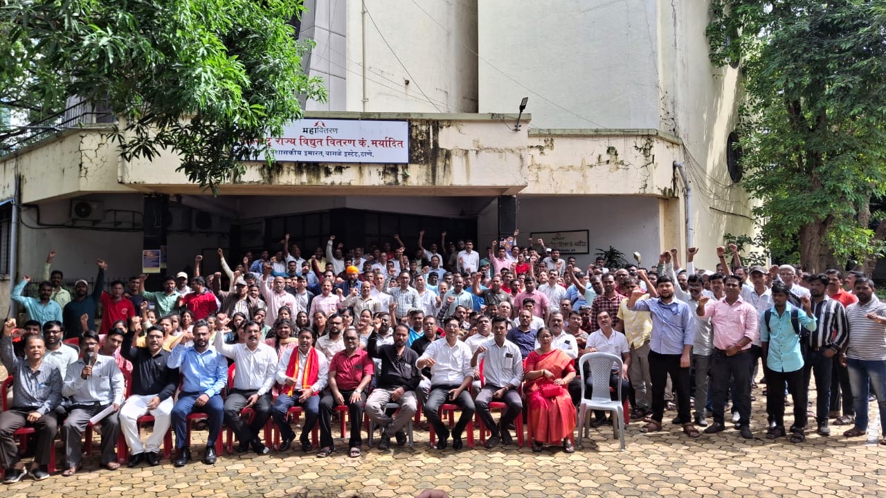 महावितरण कंपनी अधीक्षक अभियंता ठाणे मुंबई कार्यालया समोर संपात सहभागी झालेले वीज कामगार,अधिकारी, अभियंते व कंत्राटी कामगार यांची निदर्शने