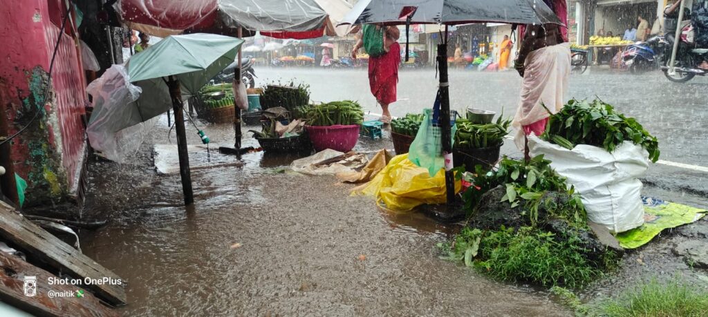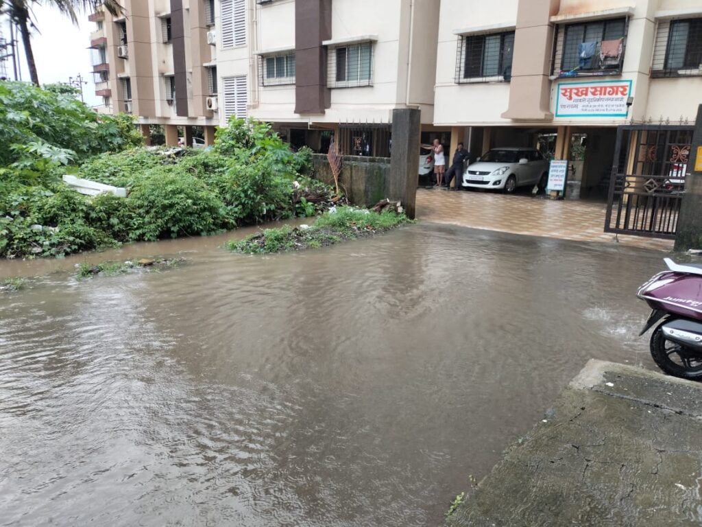 तर पेण शहरातील बाजारपेठ, विठ्ठल आळी, कुंभार आळी, उत्कर्ष नगर, चिंचपाडा यांसारख्या महत्त्वाच्या ठिकाणी अवघ्या अर्ध्या तासाच्या पडलेल्या मुसळधार पावसामुळे पाणी भरले होते.शहरातील नगरपालिका कार्यालयासमोरील गटारे तुडुंब भरून वाहत असल्याने रस्त्याच्या कडेला बसणाऱ्या भाजीपाला विक्रेत्या आदिवासी महिलांची तारांबळ उडाली तर चिंचपाडा येथील सुखसागर सोसायटीमध्ये पावसाचे पाणी शिरल्याने तेथील संरक्षक भिंत कोसळली असून पेण उत्कर्ष नगर येथून पाण्याचा निचरा होत नसल्याने अनेकांच्या घरामध्ये सुद्धा पाणी शिरून मोठ्या प्रमाणात नुकसान झाले आज सकाळ पासून पडणाऱ्या या पाण्यामुळे तालुक्यातील ग्रामीण भागात ठिकठिकाणी पाणी साचले होते.