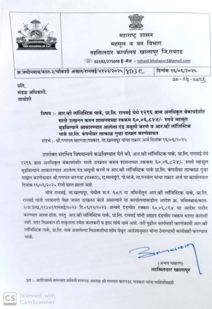 त्यानंतर महसूल खात्याने कायदेशीर प्रकिया करून आर.व्ही. लॉजिस्टिक पार्क प्रा.लि. कंपनीला केलेला दंड न भरल्याने कंपनीच्या जमीन मिळकतीचा शोध घेऊन त्यावर बोजा ठेवण्यासाठी वावोशी मंडळ अधिकारी यांना दि. २०/०६/२०२५ रोजी खालापूर तहसीलदार श्री. अभय चव्हाण यांनी पत्र काढले होते.