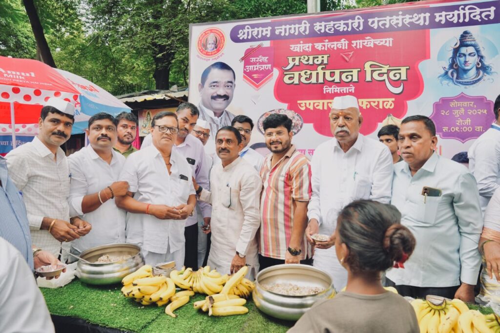 पनवेल – खांदा कॉलनी येथील श्रीराम नागरी सहकारी पतसंस्थेच्या पहिल्या वर्धांपनदिनानिमित्ताने पनवेलमधील जागृत देवस्थान असलेल्या खांदेश्वर मंदीरात तब्बल २०० किलो साबुदाणा खिचडी आणि ५०० डझन केळी असा उपवासाचा फराळ वाटप करण्यात आले. आमदार प्रशांत ठाकूर यांच्या उपस्थितीत पार पडलेल्या फराळ वाटपाचा लाभ सोमवारी सकाळपासून हजारो शिवभक्तांनी घेतला.