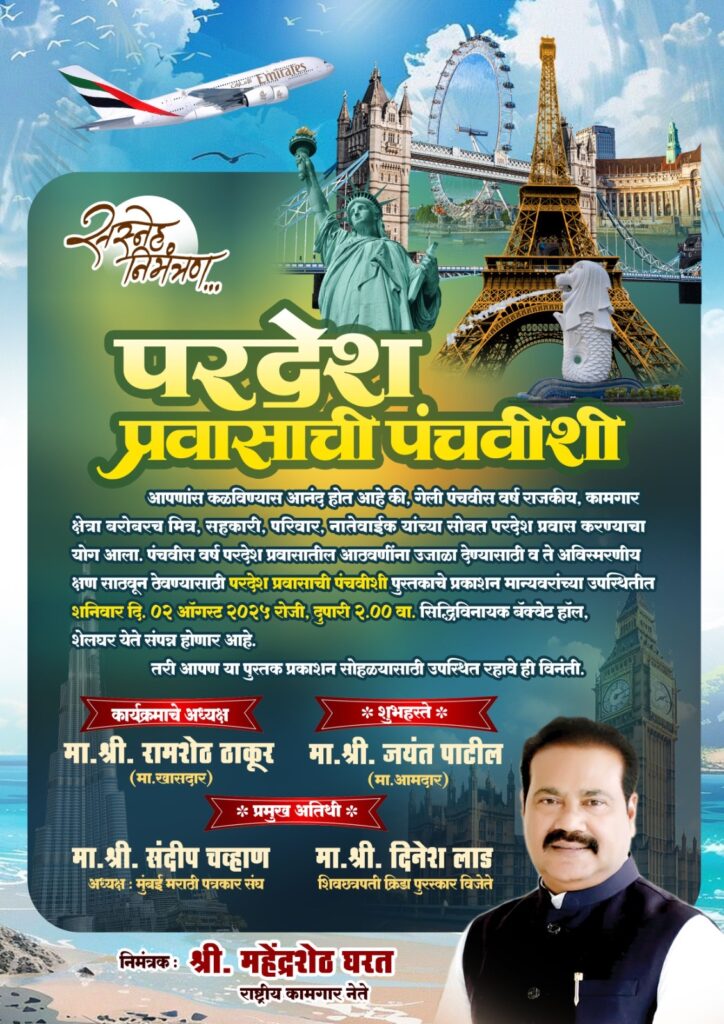 त्याचे प्रकाशन शनिवारी, २ ऑगस्ट रोजी दुपारी ३ वाजता होणार आहे. माजी खासदार रामशेठ ठाकूर आणि शेकापचे नेते जयंत पाटील हे प्रकाशन सोहळ्यानिमित्त एकाच व्यासपीठावर येणार आहेत. प्रमुख पाहुणे म्हणून मुंबई मराठी पत्रकार संघाचे अध्यक्ष आणि ‘बित्तंबातमी’ या दैनिकाचे संपादक-मालक संदीप चव्हाण उपस्थित राहणार आहेत. हा सोहळा उलवे नोड येथील शेलघर येथे सिद्धिविनायक बॅंक्वेट हाॅलमध्ये होणार आहे. अनेक मान्यवरांच्या उपस्थितीत होणारा हा सोहळा रसिकांसाठी एक मेजवानी ठरेल. त्यामुळे या प्रकाशन सोहळ्याला सर्वांनी उपस्थित राहावे, असे आवाहन आंतरराष्ट्रीय कामगार नेते महेंद्रशेठ घरत यांनी केले आहे.