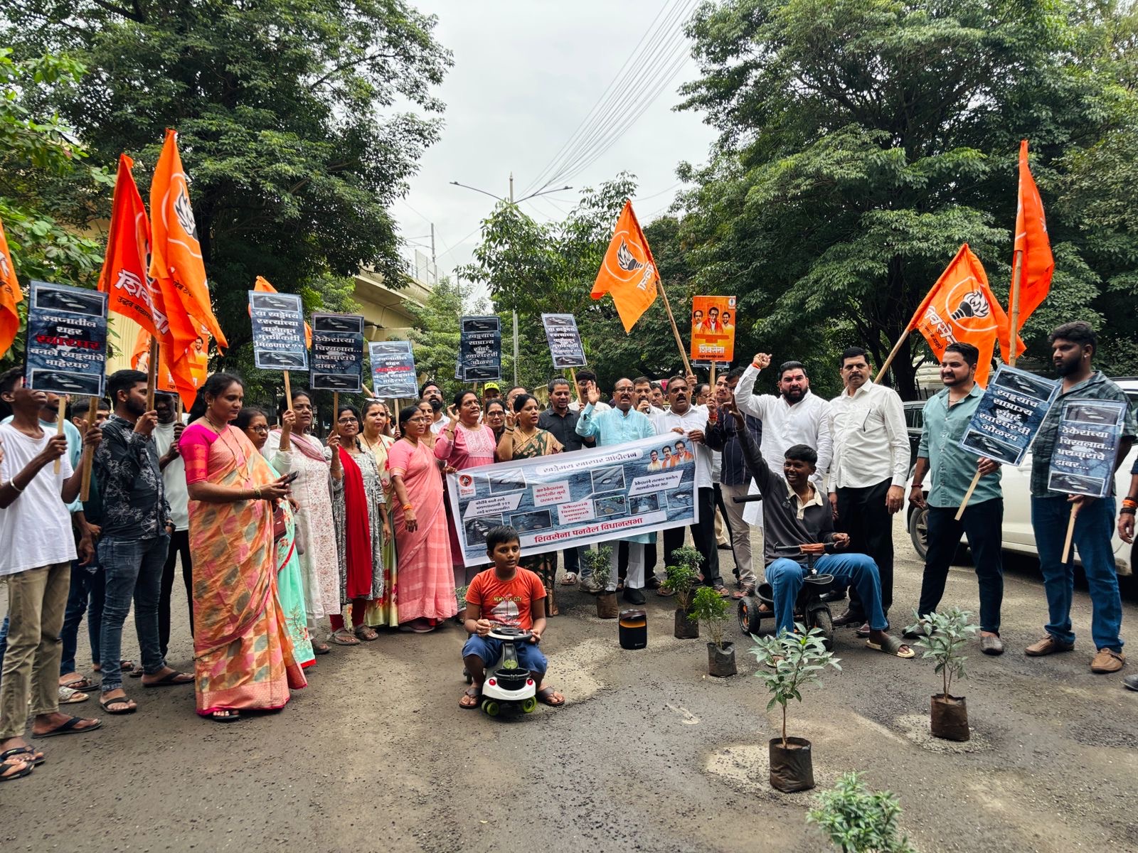 पनवेल, दि.3 (वार्ताहर) ः पनवेल महापालिका अंतर्गत येणार्या खारघर शहराला स्मार्ट सिटी हा दर्जा मिळाला असला तरीही शहरात मुख्य रस्त्यावर जागो जागी खड्डे पडले आहेत फक्त 15 दिवसांपुर्वी केलेल्या डांबरीकरणातुन रस्ते वाहुन गेले व भ्रष्ट कंत्राटदारांचा भ्रष्टाचार उघडा पडला आहे , महापालिका कोटीचे निविदा देतात ते रस्ते बांधण्यासाठी काढतात का खड्डे पाडण्यासाठी असा प्रश्न आता खारघर वासीयांना व समस्त पनवेलकरांना पडलेला आहे. याच खड्ड्यांच्या भ्रष्टाचाराबाबत आज शिवसेना जिल्हाप्रमुख शिरीष घरत यांच्या नेतृत्वाखाली तसेच शिवसेना महानगर प्रमुख अवचित राऊत यांच्या आयोजनातून खड्डेमय खारघर विरोधात शिवसेना वतीने खड्डामध्ये झाडे लावत आंदोलन करण्यात आले.
